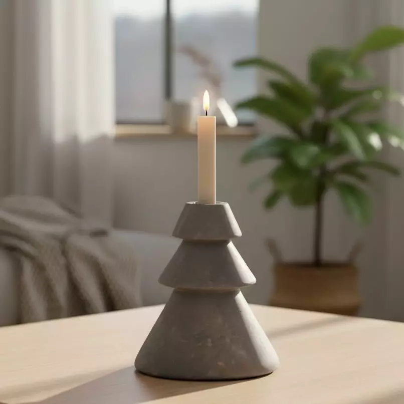 Harmaa sementtinen kuusipuun muotoinen kynttilänjalka kruunukynttilälle.