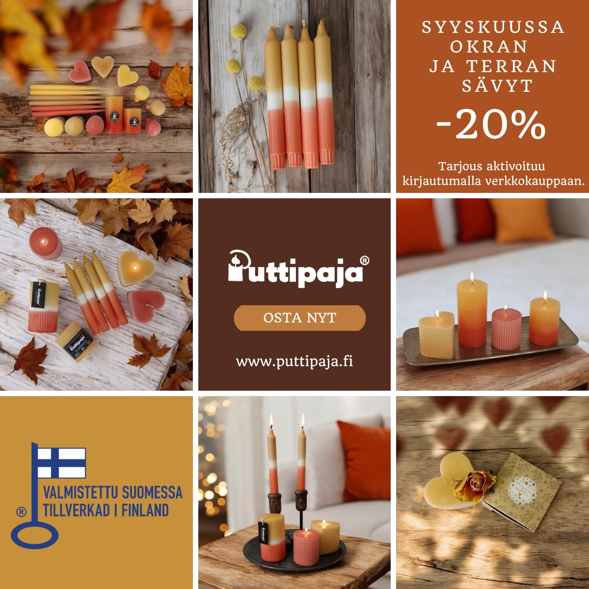 Puttipajan tehtaanmyymälän edut: II-laadun kynttilää tarjoushinnoin. II-laadun kynttilät ovat värikokeiluja, värivirheellisiä tai niissä on pieniä pintakolhuja.