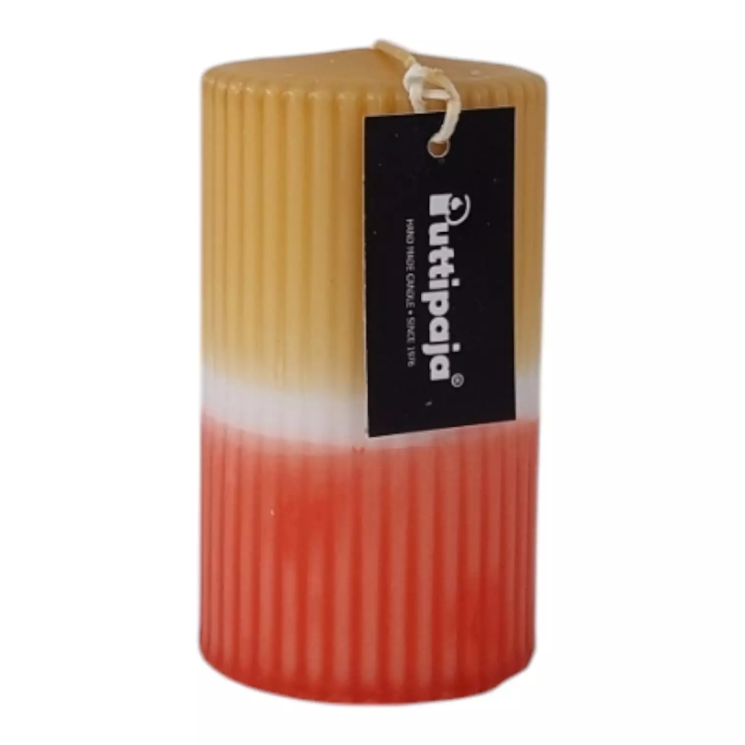 Pintavärjätty kolmivärinen vekkikynttilä Väri: Okra ja terra Koostumus: 100 % parafiinia Kynttilän koko: 7x12 cm Kynttilän paloaika: ~45 h