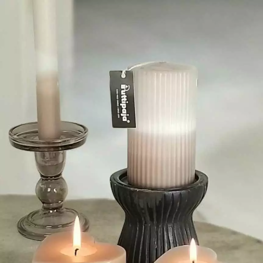 Pintavärjätty kaksivärinen vekkikynttilä Väri: Puuteri, Kaakao, Harmaa Koostumus: 100% parafiinia Kynttilän koko: 7x12 cm Kynttilän paloaika: ~45 h
