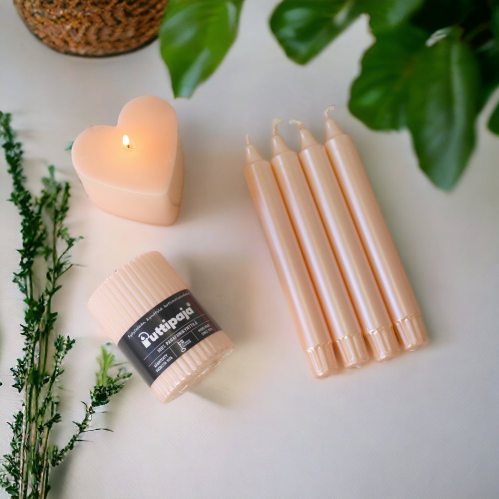 Aprikoosin värinen pintavärjätty sydänkynttilä 8 cm. Kynttilän paloaika 40 tuntia.