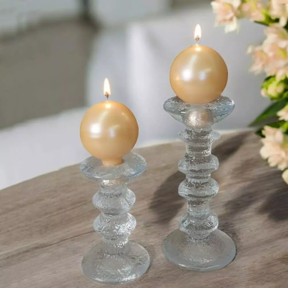 Metallihohtoinen pintavärjätty jalallinen pallokynttilä Väri: helmiäis keltainen Koostumus: 100% parafiinia Koko: Kynttilän halkaisija 6 cm. Kynttilän kannan korkeus 2 cm ja halkaisija noin 1,5 cm Kynttilän paloaika: ~12 h Myyntierä: 2 kpl/laatikossa