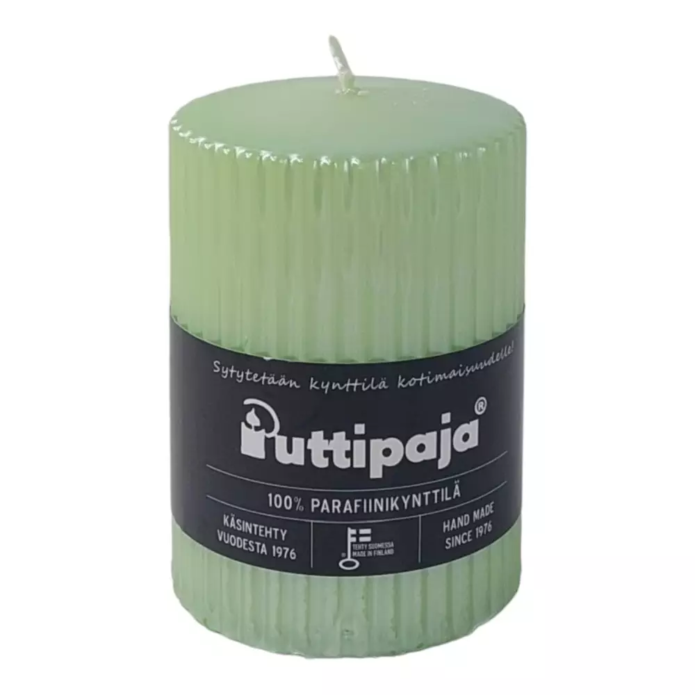 Puttipajan läpivärjätty käsinvalettu lehmuksenvihreä pöytäkynttilä.