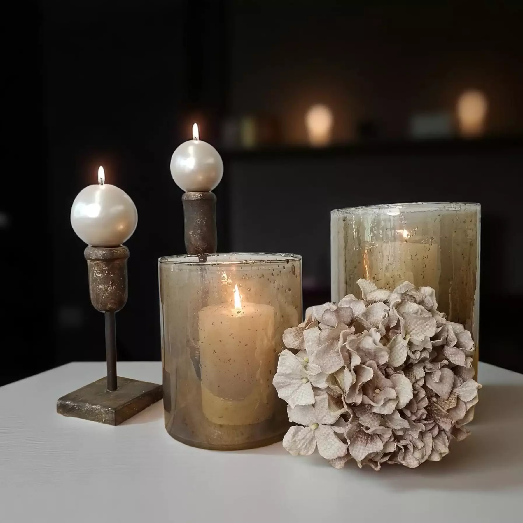 Hohtava pyöreä kuplalasinen vaasi pöytäkynttilälle Pieni: Koko: korkeus 15 cm halkaisija 13 cm Väri: ruskea pronssi Materiaali: lasi Paino: 750 g Pesu: haalealla pesuaine vedellä Iso: Koko:... Lue lisää
