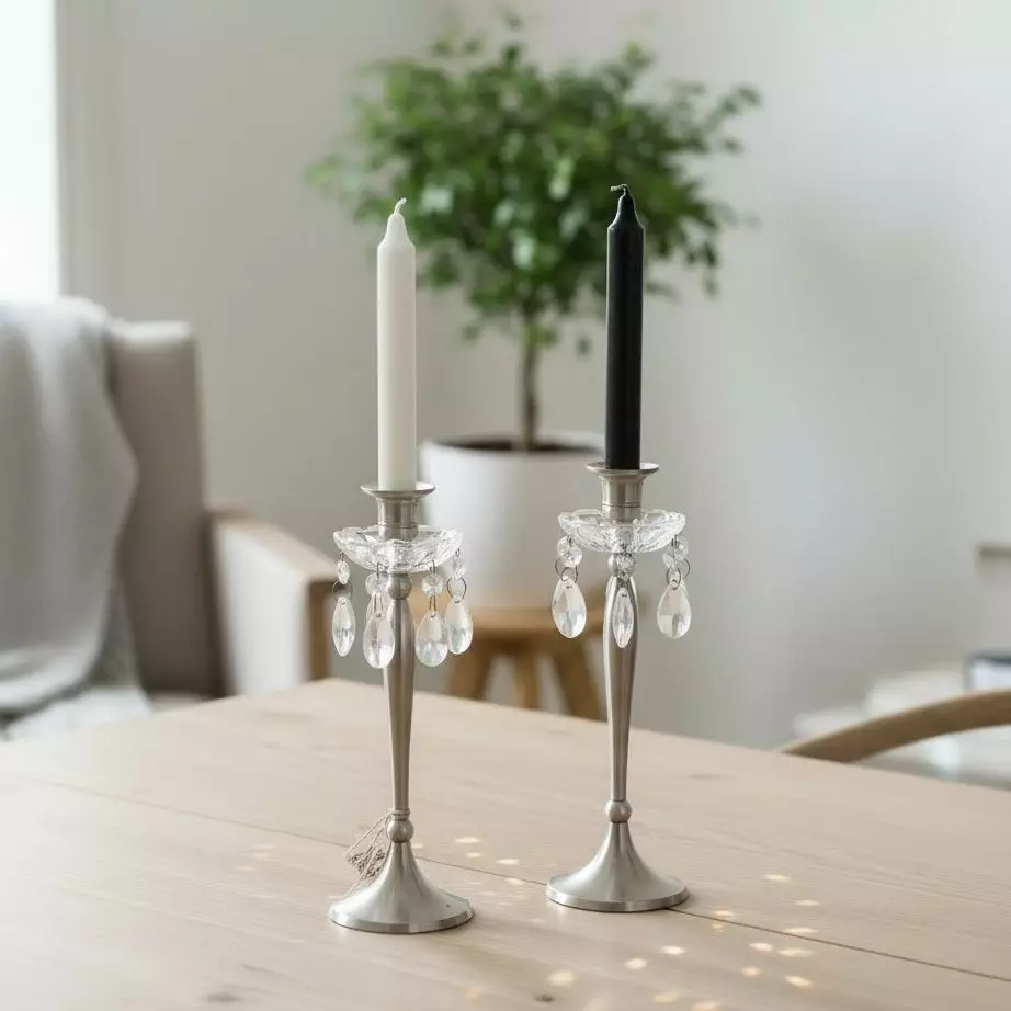 Hopean sävyinen metallinen ylväs Harmonia-sarjan kynttillänjalka kruunukynttilälle. Lasinen mansetti on irrotettavissa kynttilänjalasta. Väri: hopea / kirkas Korkeus matala: 24 cm Korkeus... Lue lisää