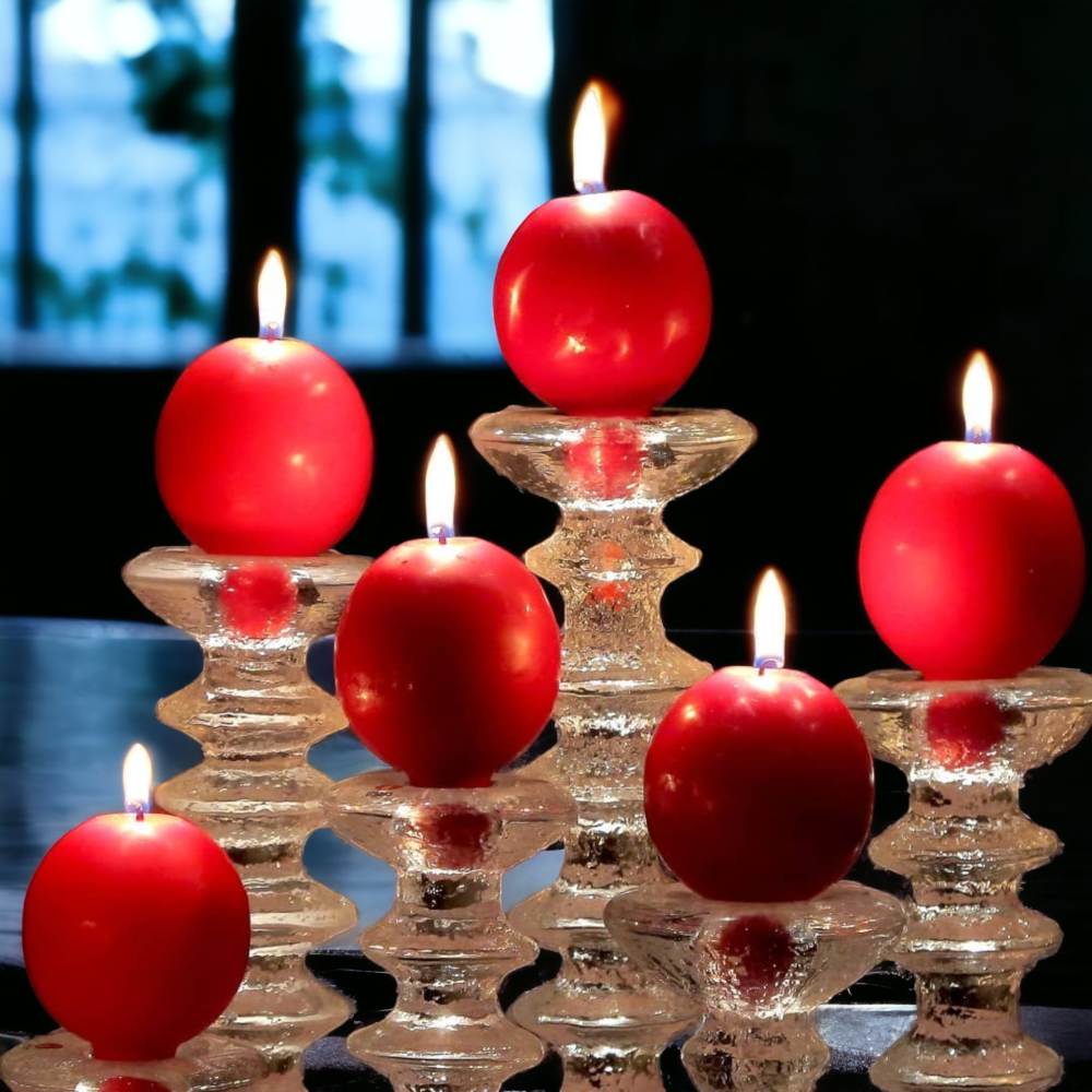 Puttipajan läpivärjätty käsinvalettu tummanpunainen pöytäkynttilä.