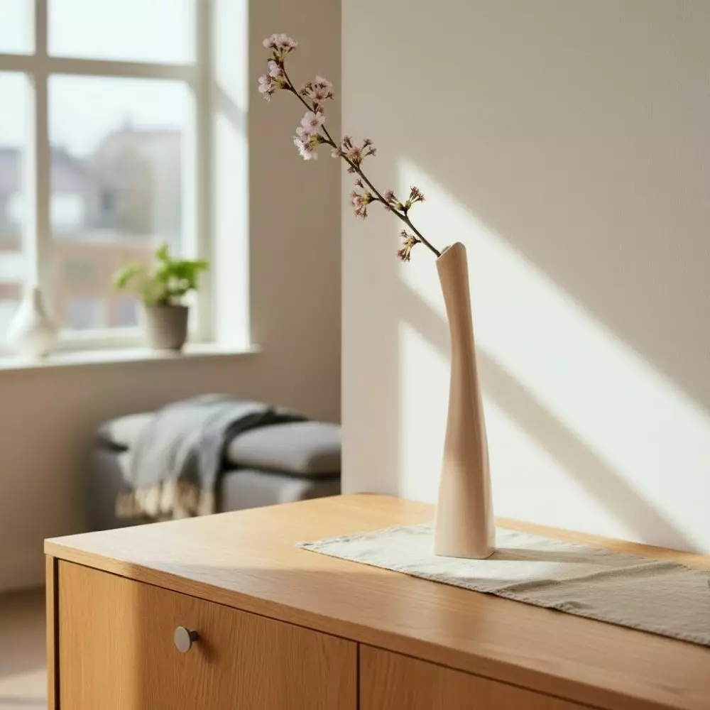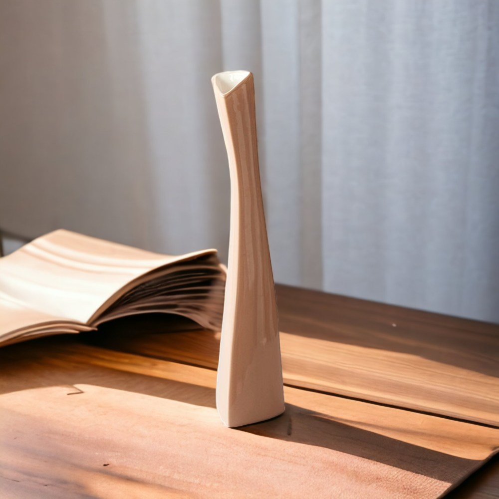 Tämä tyylikäs, korkea maljakko sopii täydellisesti yhdelle pitkävartiselle kukalle, esim. ruusulle tai orkidealle. Värinä on ihastuttava puuteri.