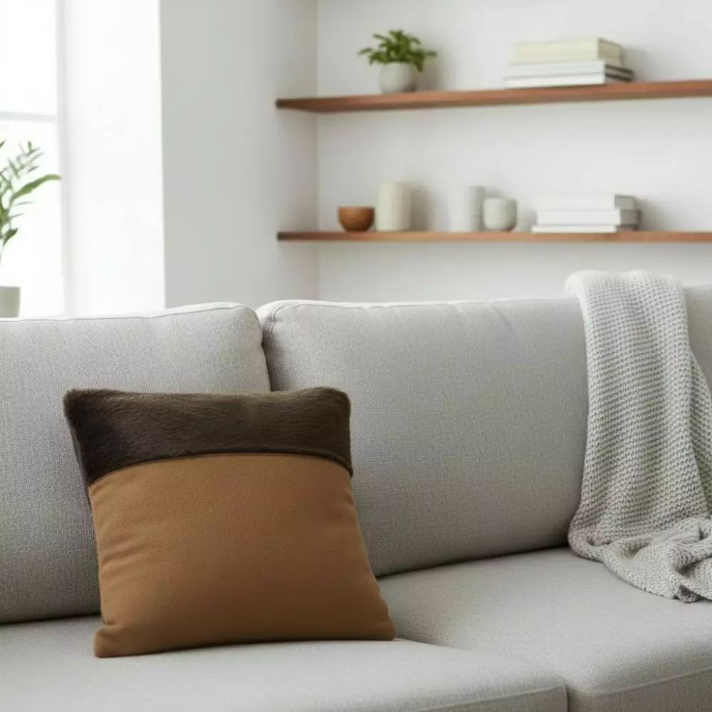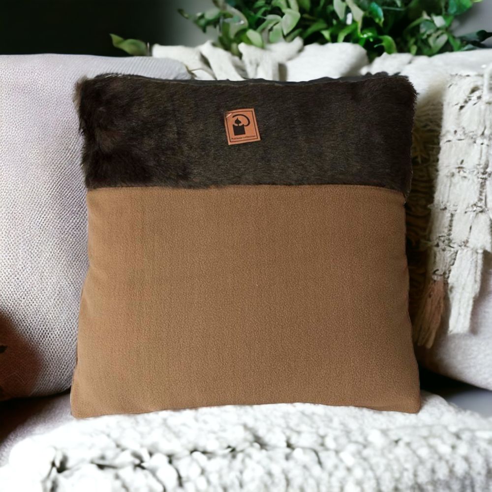 Ruskea tyynynpäällinen, jonka yläosaa koristaa tummanruskea keinoturkis.