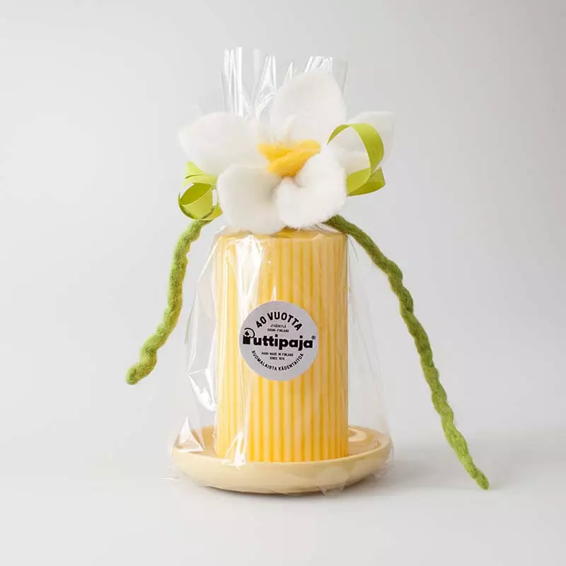 Kaunis keväinen lahjapaketti sisältää vekkikynttilän, alusen ja huopakukan. Pintavärjätty vekkikynttilä Väri: Keltainen Koostumus: 100% parafiinia Kynttilän paloaika: 7x12 cm ~55 h... Lue lisää