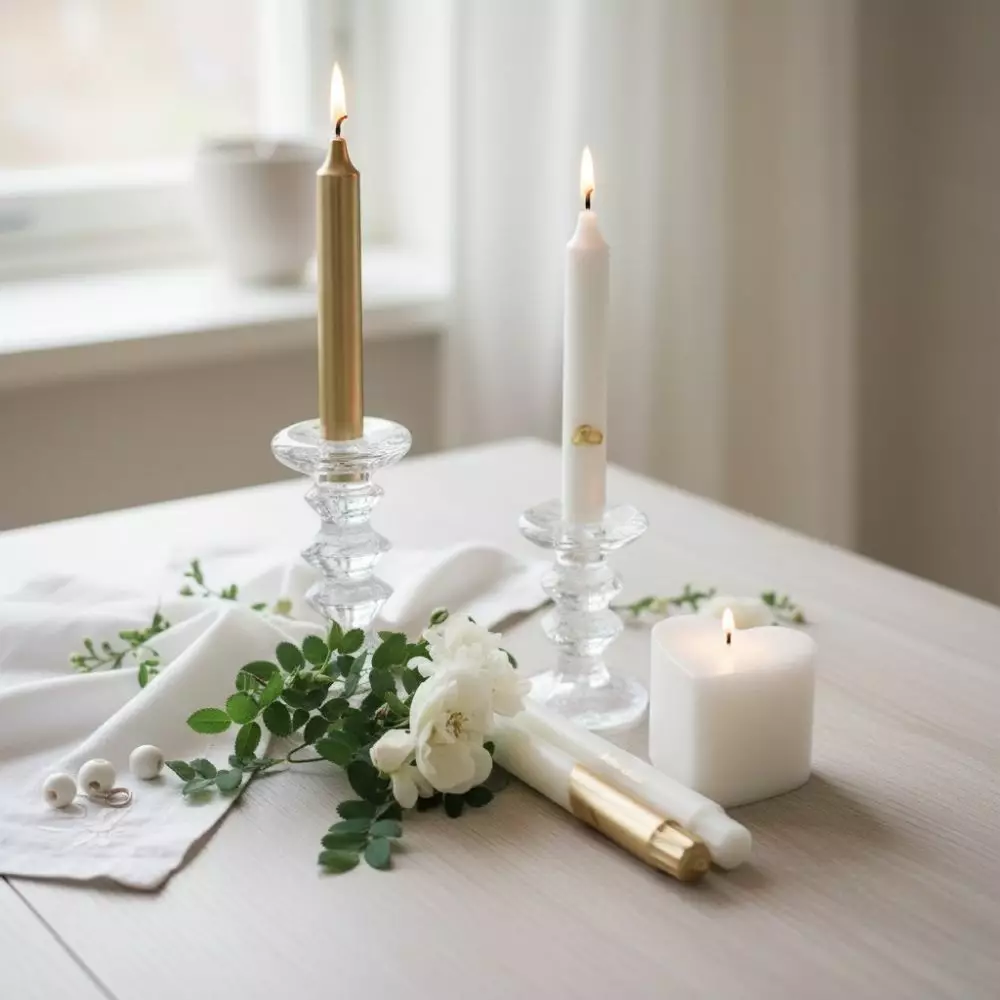 Onnea ja juhlan loistoa! Nämä elegantit valko–kultaiset kruunukynttilät on suunniteltu tuomaan arvokkuutta ja tunnelmaa kaikkiin tärkeisiin hetkiin – kihlajaisiin ja häihin.