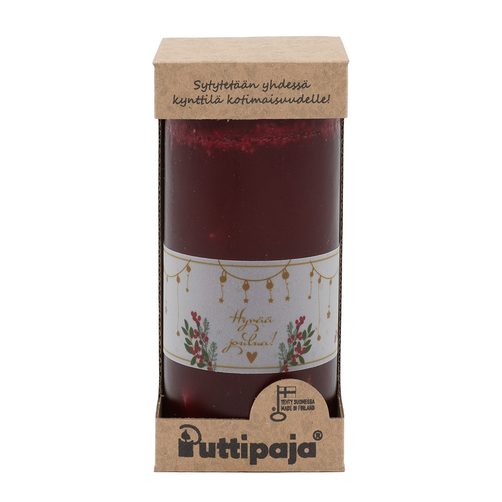 Viininpunainen läpivärjätty 15 cm kynttilä lahjalaatikossa sopii mainiosti lahjaksi tai joulutervehdykseksi.
