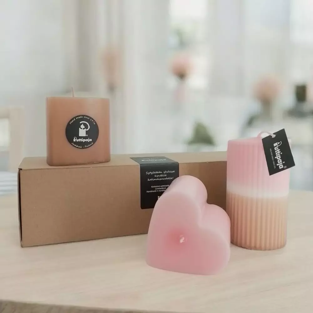 Hemmottelukynttilät kotoiluun Ihana pakkaus sisältää kaksi suosittua sydänkynttilää ja yhden dip dye -vekkikynttilän. Kynttilät on valmistettu käsityönä tehtaallamme Vaajakoskella. Värit... Lue lisää