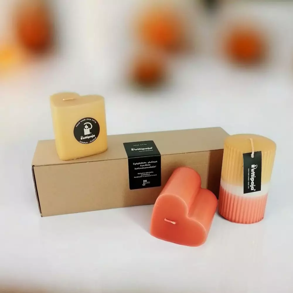 Ihana pakkaus sisältää kaksi suosittua sydänkynttilää ja yhden dip dye -vekkikynttilän. Kynttilät on valmistettu käsityönä tehtaallamme Vaajakoskella. Värit ovat harmoniset okra ja terra. Täydellinen valinta syksyn tunnelmointiin, kotiin tai lahjaksi!