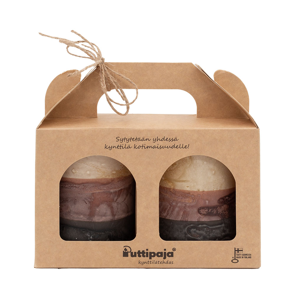 Lahjapakkaus sisältää kaksi tervantuoksuista kynttilää