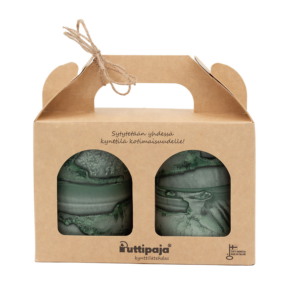 Lahjapakkaus sisältää kaksi tervantuoksuista kynttilää