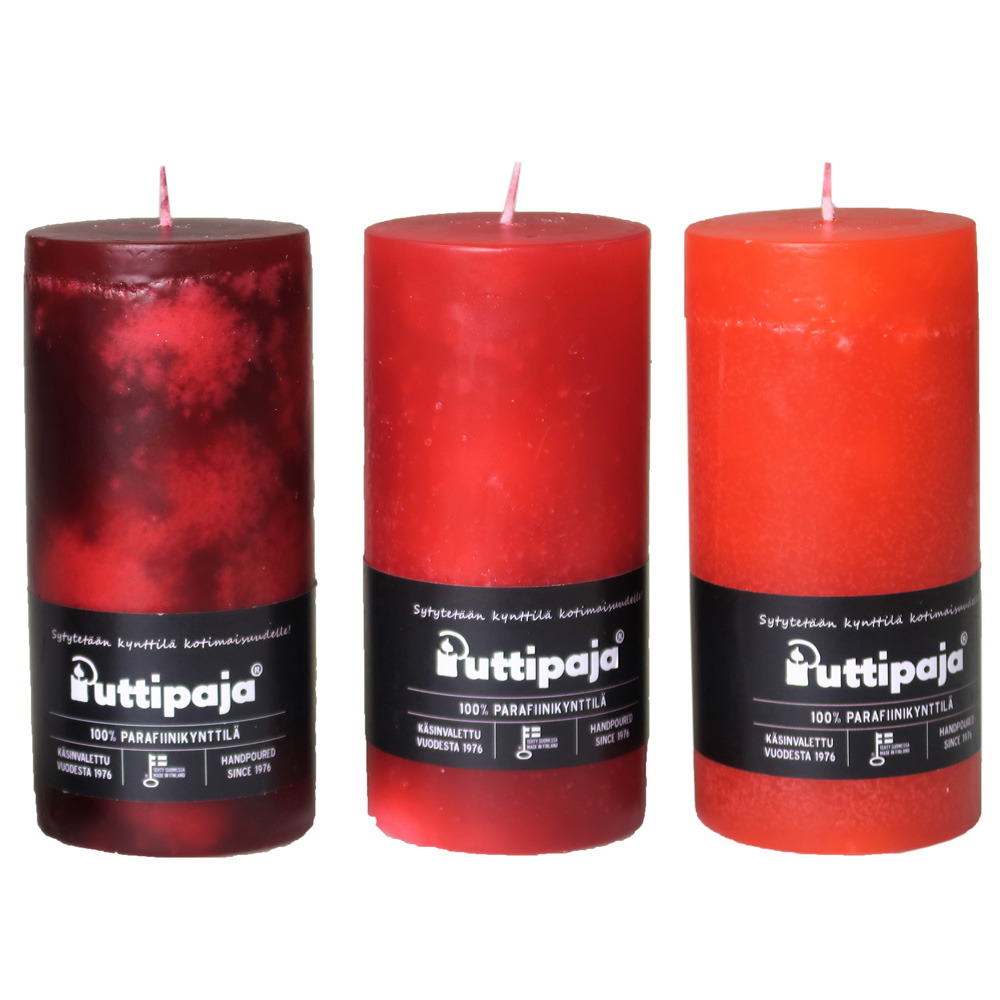Puttipajan raitakynttilöissä leikitellään erilaisilla herkullisilla väriyhdistelmillä. Läpivärjätty raitakynttilä säilyttää kauniin värinsä myös kynttilän palaessa. Puttipajan pöytäkynttilän pintakuviointi on vivahteikkaan eläväinen, jota kynttilän liekin valo korostaa kauniisti.