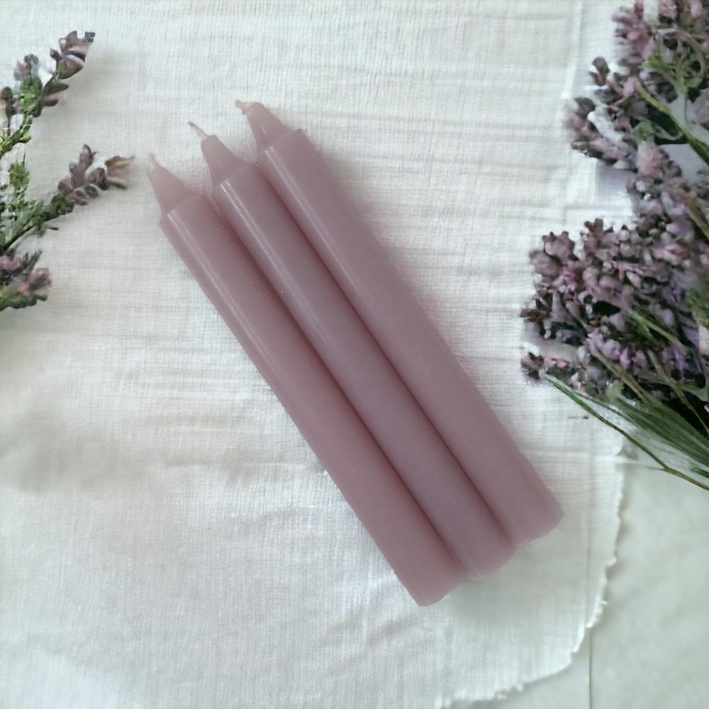 Läpivärjätty kruunukynttilä, 20 kpl laatikko Väri: Laventeli Koostumus: 75% parafiinia, 25% steariinia Koko: 2,2x20 cm Kynttilän paloaika: ~9 h