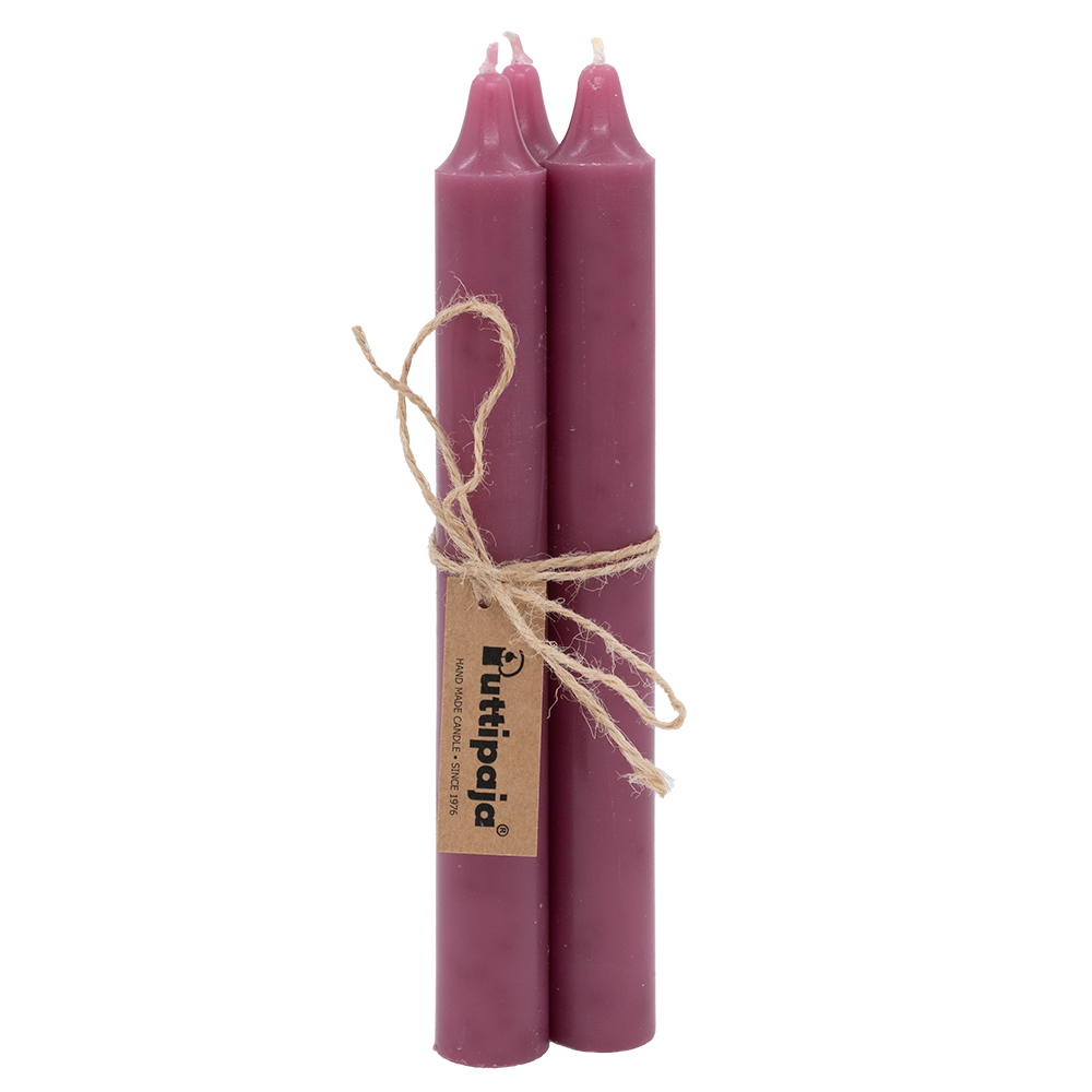Läpivärjätty kruunukynttilä, 20 kpl laatikko Väri: Marjapuuro Koostumus: 75 % parafiinia, 25% steariinia Koko: 2,2x20 cm Kynttilän paloaika: ~9 h