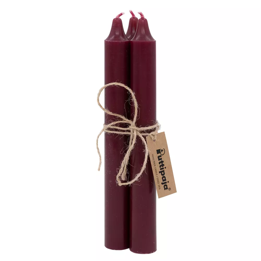 Läpivärjätty kruunukynttilä, 20 kpl laatikko Väri: Viini Koostumus: 75 % parafiinia, 25% oliivisteariinia Koko: 2,2x20 cm Kynttilän paloaika: ~9 h