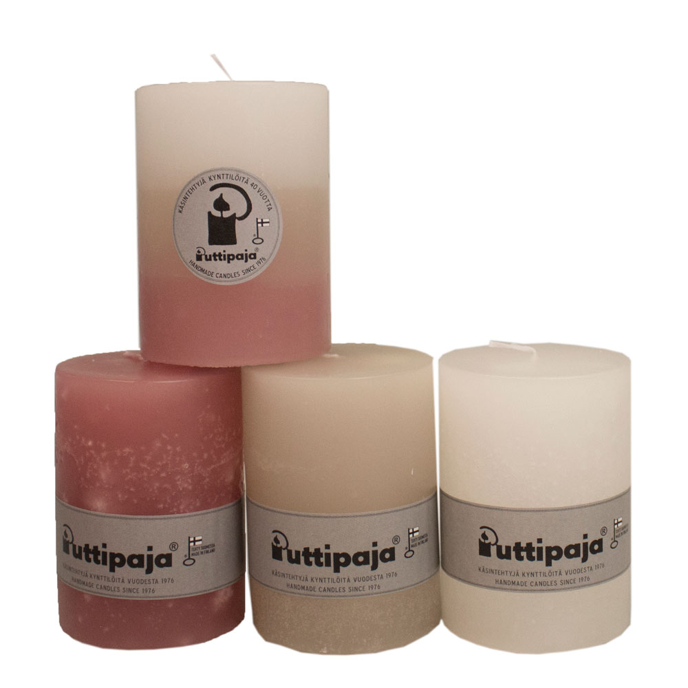 Paketin sisältämät kynttilät ovat valkoinen, puuteri, vanha roosa sekä Talvenlumo-raitakynttilä.