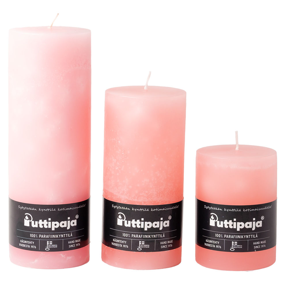 Läpivärjätty pöytäkynttilä Väri: Vaaleanpunainen Koostumus: 100% parafiinia Kynttilän paloaika: 7x10 cm~45 h 7x15 cm~75 h 7x20 cm~90 h 7x25 cm~130 h 7x30 cm~160 h