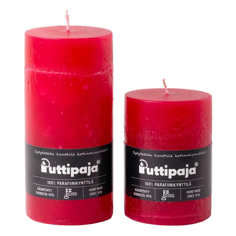 Puttipajan läpivärjätty käsinvalettu vadelman värinen 10 cm korkuinen pöytäkynttilä.