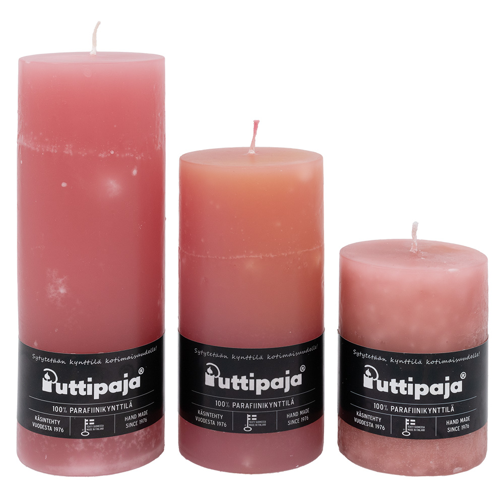 Puttipajan läpivärjätty käsinvalettu vanhan roosan pöytäkynttilä.