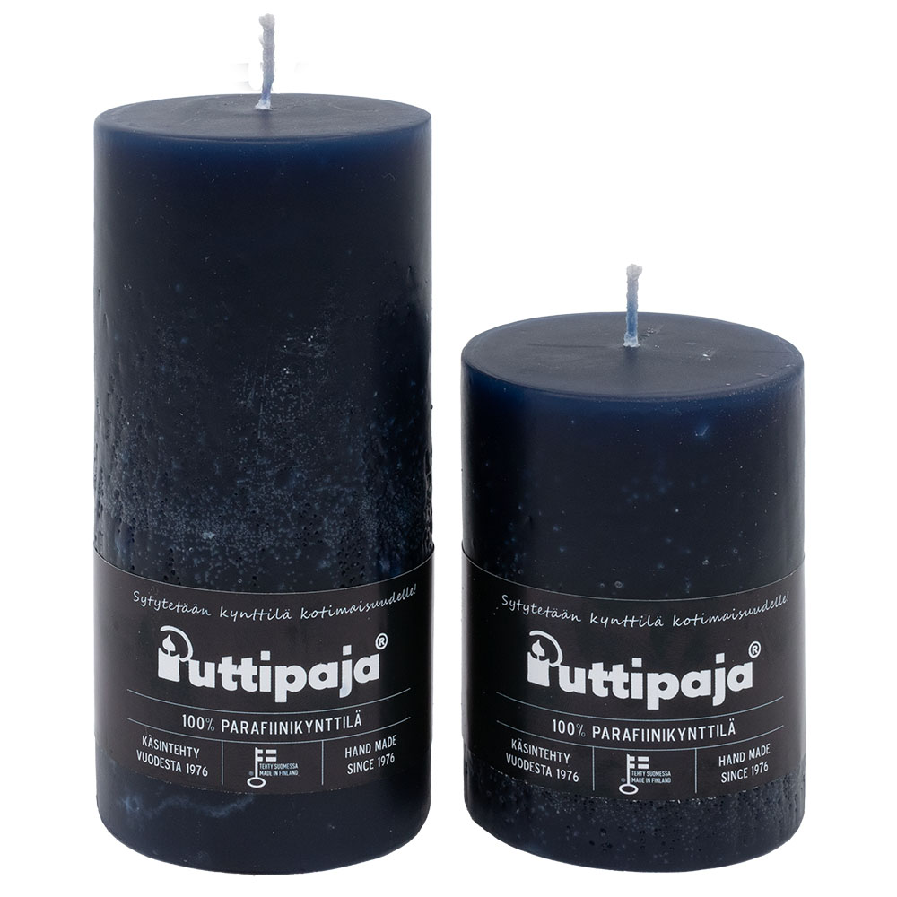Puttipajan läpivärjätty käsinvalettu yönsininen 10 cm korkuinen pöytäkynttilä.