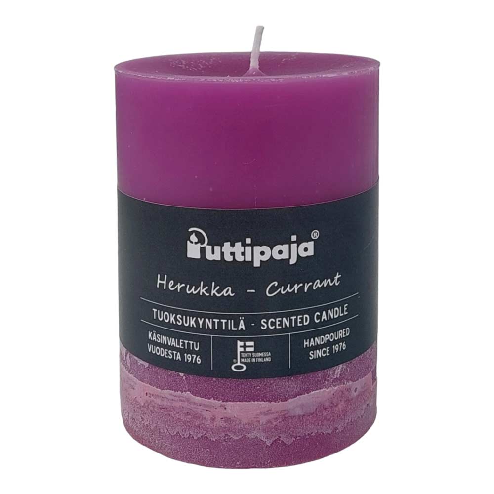 Herukka-tuoksukynttilän tuoksu on makea ja marjainen. Sävyltään kynttilä on tumman pinkin ja violetin sekoitus.
