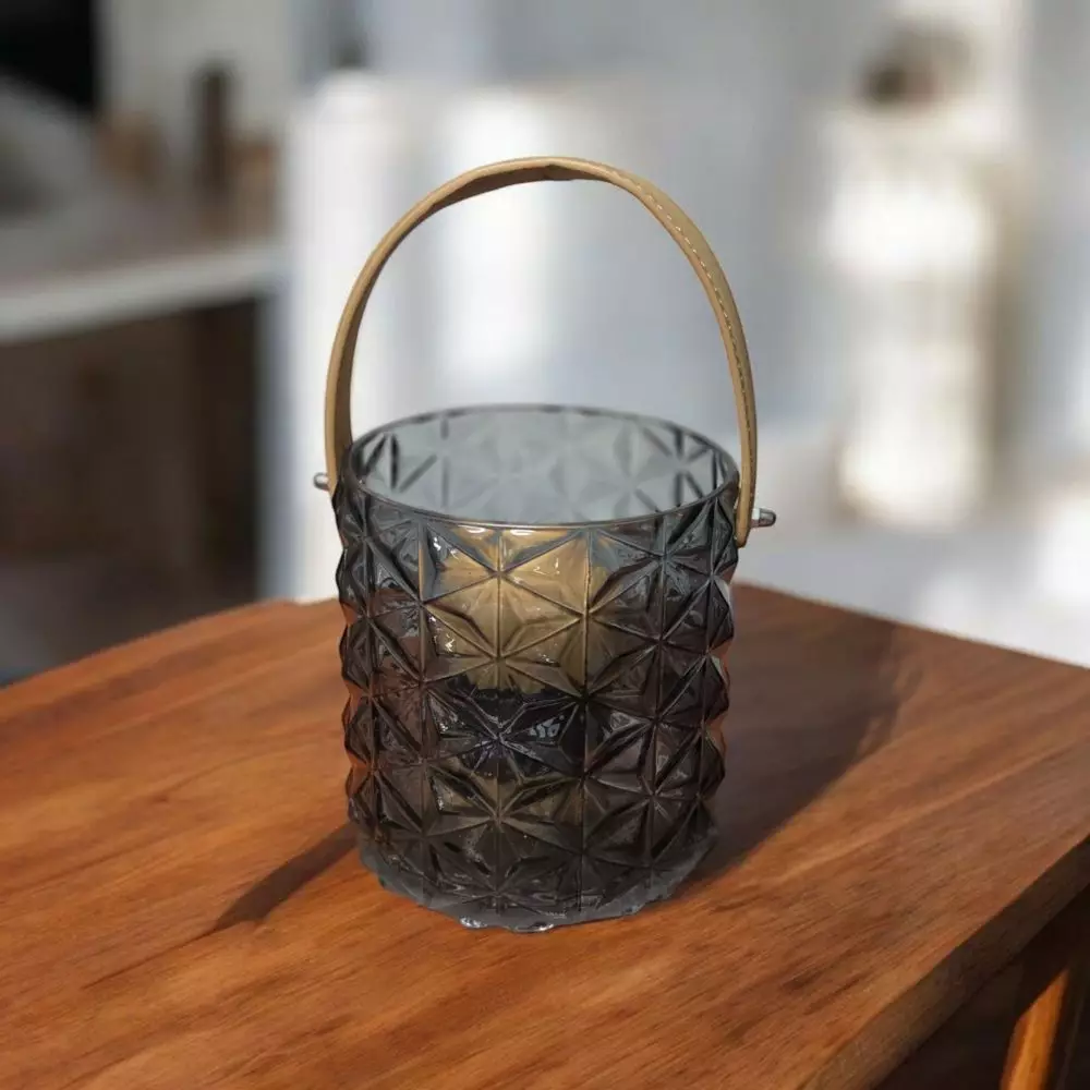 Harmaan värisessä lasilyhdyssä on nahkamainen sanka, joka on kiinnitetty lasiin hopeanvärisillä muttereilla.