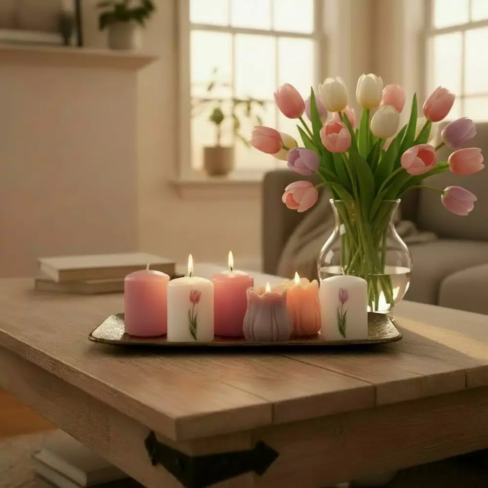 roosa lila kynttilätulppaanikynttilä roosa lilakevään kynttilät pastellisävytpöytäkynttilät lahjapakkauskäsintehty kynttilä SuomiPuttipaja kynttilät kevätkeväinen sisustus pastellikevätlahjatulppaanikuvio kynttiläroosa kynttilä lila kynttilä