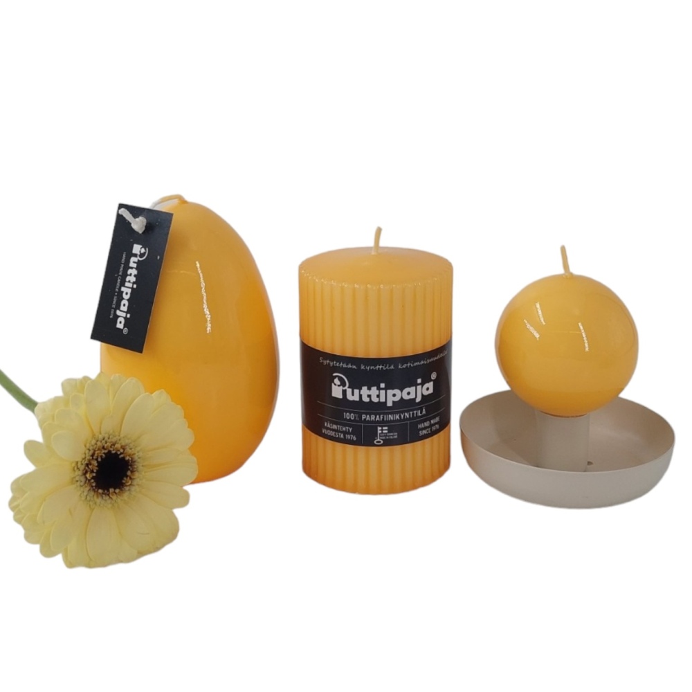 Keltaisen väriset pintavärjätyt Loiste-kynttilät. Ihastu kynttilän kiiltävään pintaan. Tätä väriä on saatavilla 10 cm ja munan mallisina.