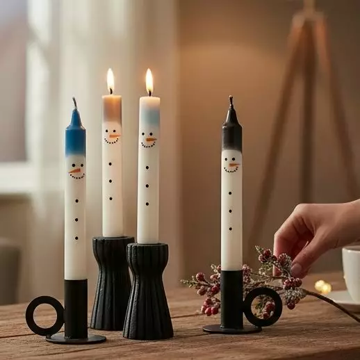 Tuo talven iloa ja leikkisyyttä kattaukseen näillä käsintehdyillä Lumiukko-kruunukynttilöillä! Jokainen kynttilä on valmistettu huolella Puttipajan pajalla ja koristeltu suloisella lumiukon ilmeellä. Setissä on neljä kruunukynttilää, joissa on eriväriset hatut – musta, sininen ja harmaa – tuomaan vaihtelua ja tunnelmaa.