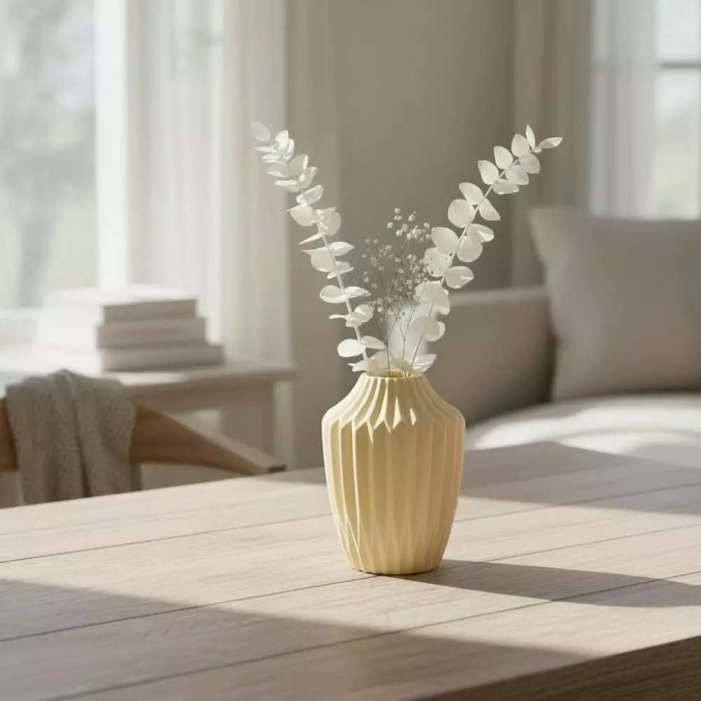 Vaaleankeltainen hempeä keraaminen kukkamaljakko, jonka korkeus on 12 cm. Pintaa koristaa kaunis vekkimäinen muotoilu.