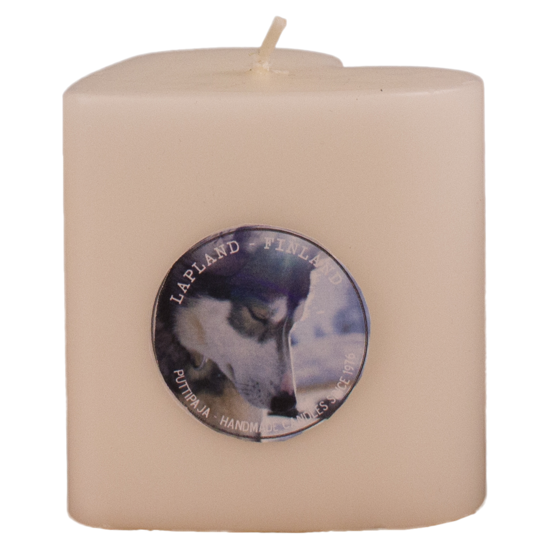 Kaunis valkea sydänkynttilä. Tarrassa Husky-koiran kuva sekä teksti "Lapland - Finland"