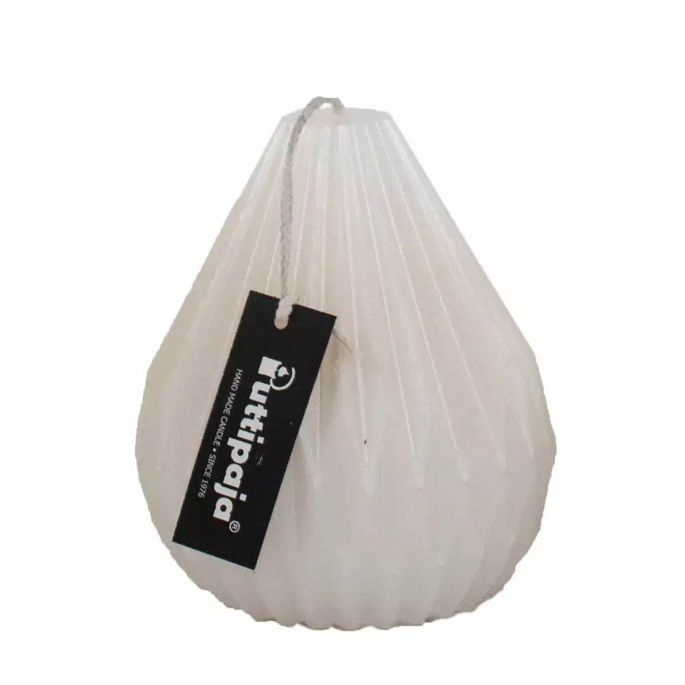 Pintavärjätty metallihohtoinen pisarakynttilä Väri: Valkoinen Koostumus: 88 % parafiini, 12 % steariini Korkeus 10 cm Halkaisija leveimmästä kohdasta n. 9 cm Kynttilän paloaika: ~40h
