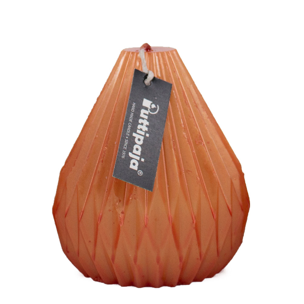Pintavärjätty metallihohtoinen pisarakynttilä Väri: Oranssi Koostumus: 88 % parafiini, 12 % steariini Korkeus 10 cm Halkaisija leveimmästä kohdasta n. 9 cm Kynttilän paloaika: ~40h