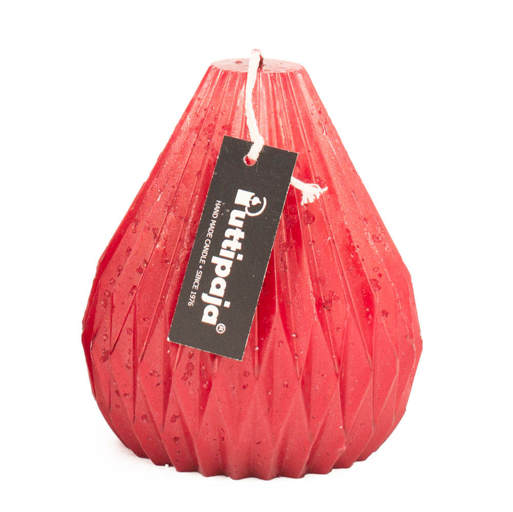Pintavärjätty metallihohtoinen pisarakynttilä Väri: Punainen Koostumus: 88 % parafiini, 12 % steariini Korkeus 10 cm Halkaisija leveimmästä kohdasta n. 9 cm Kynttilän paloaika: ~40h