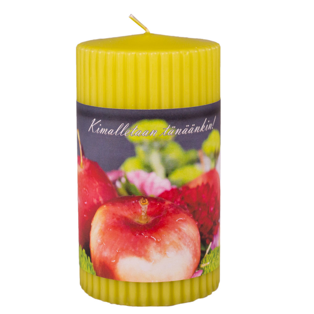 Jyväskylässä käsintehty pintavärjätty vekkikynttilä, jota koristaa Ilona Pietiläisen kuva omenoista ja kukista.