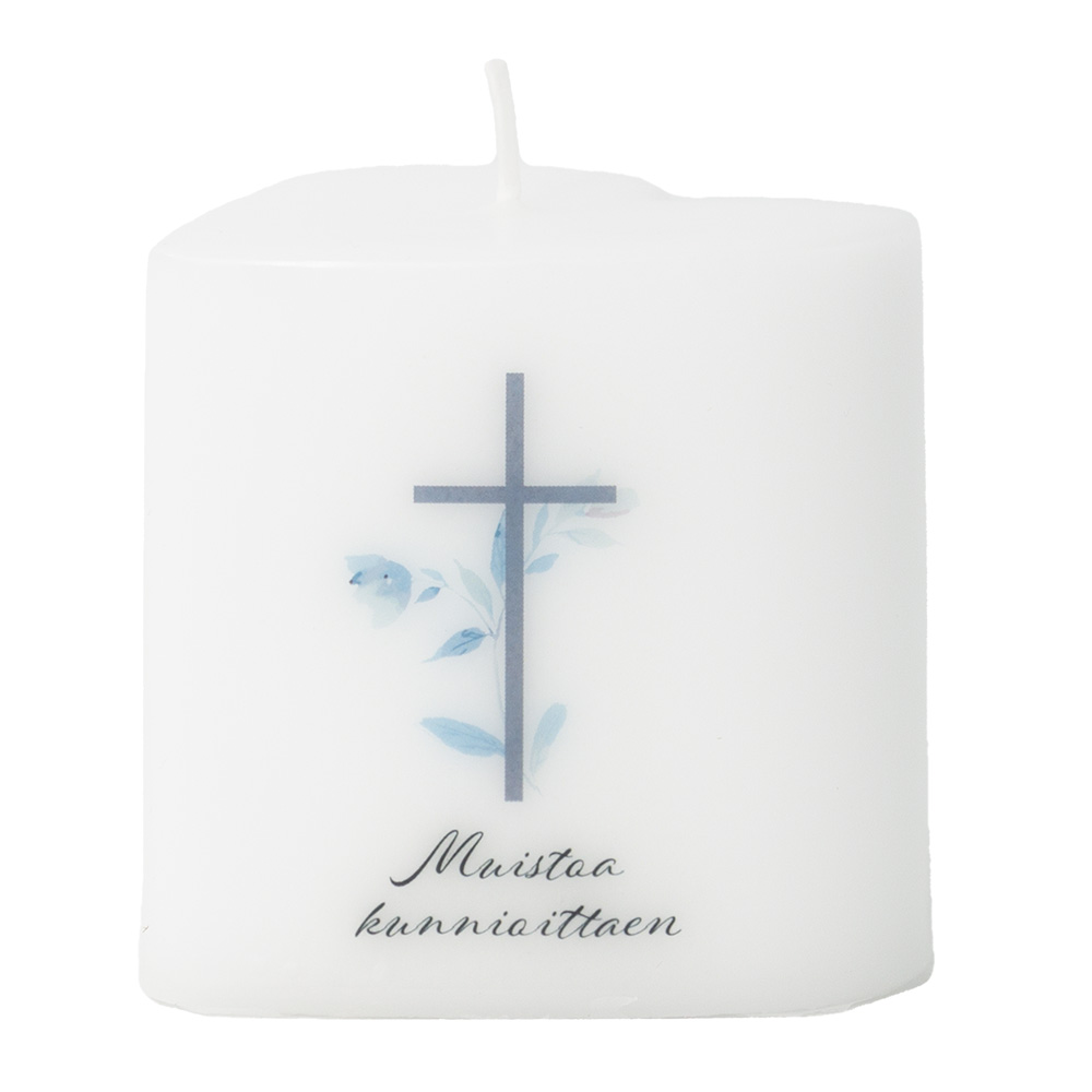 Muistokynttilällä on hyvä kunnioittaa vainajan läheisiä hienostuneella tavalla. Muistokynttilän kuva on tehty siirtokuvatekniikalla ja ristin alapuolella lukee "Muistoa kunnioittaen". Muistokynttilää on saatavilla 8 cm sydämen, 12 cm neliön ja 14 cm pyöreän muotoisina