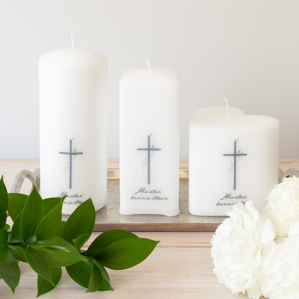 Muistokynttilällä on hyvä kunnioittaa vainajan läheisiä hienostuneella tavalla. Muistokynttilän kuva on tehty siirtokuvatekniikalla ja ristin alapuolella lukee "Muistoa kunnioittaen". Muistokynttilää on saatavilla 8 cm sydämen, 12 cm neliön ja 14 cm pyöreän muotoisina.