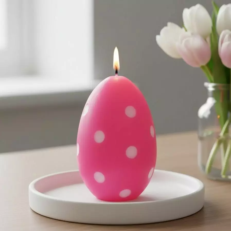 Munakynttilä, pilkullinen tai yksivärinen Väri: Pinkki Koostumus: 100% parafiinia Koko: Kynttilän halkaisija 8 cm. Kynttilän korkeus 13 cm. Kynttilän paloaika: ~40 h