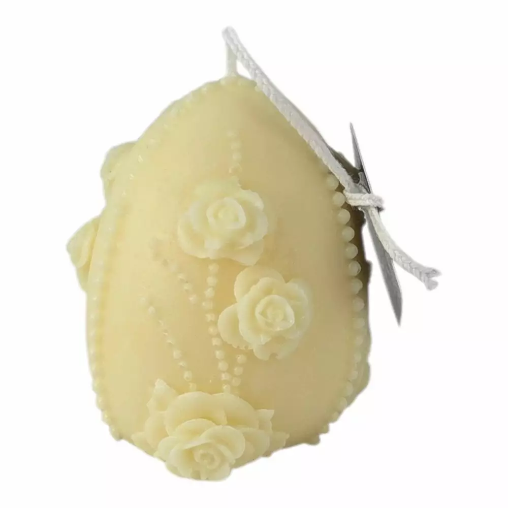 Kynttilän koristeellinen munamuoto ja ruusukuviointi tekevät siitä näyttävän sisustuselementin, ihastuttavan pääsiäistuliaisen ja täydellisen lahjan kevään juhliin.