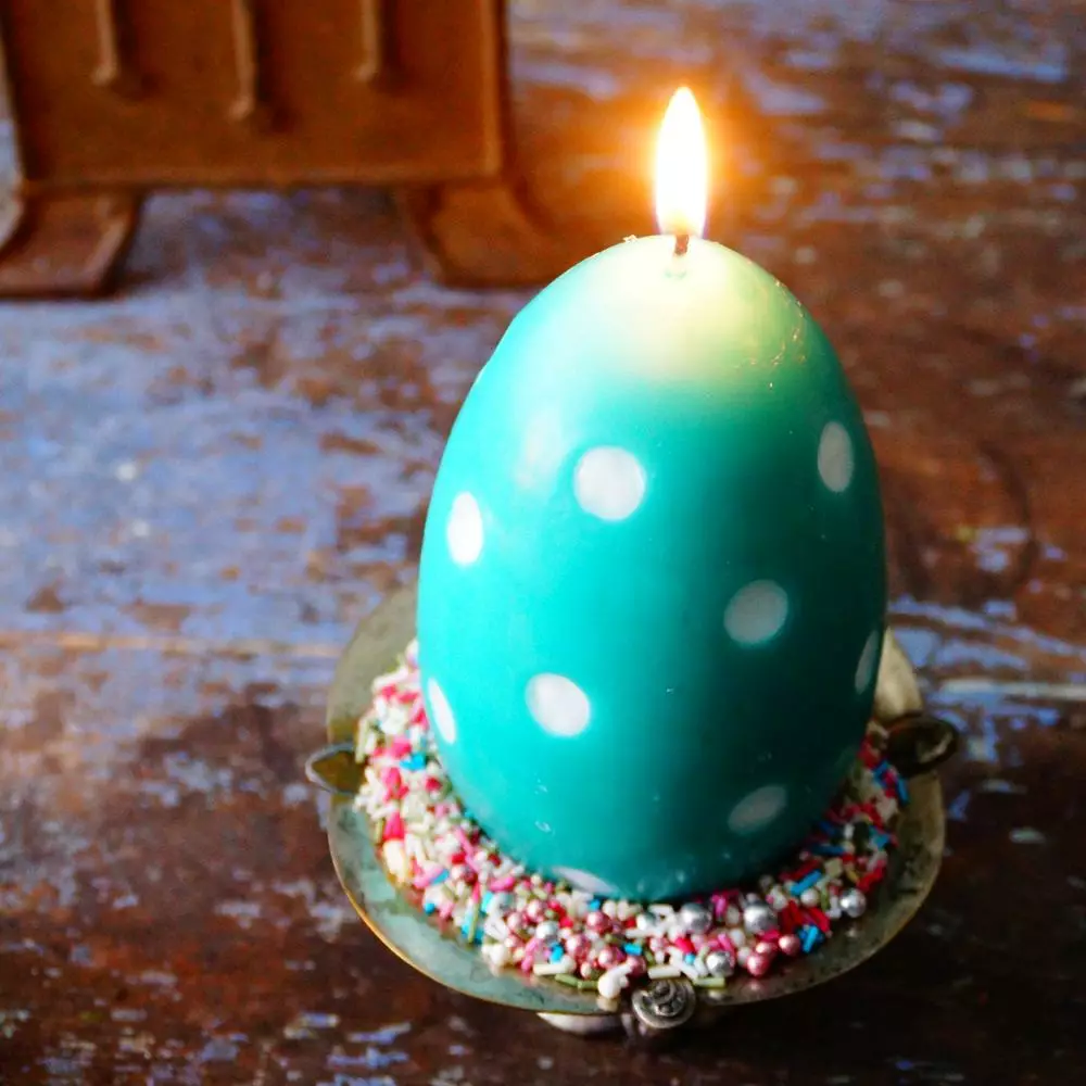 Tämä kynttilä on mainio koriste pääsiäiseen, mutta kynttilöiden heleät värit sulostuttavat vielä pitkälle kevääseen saakka.