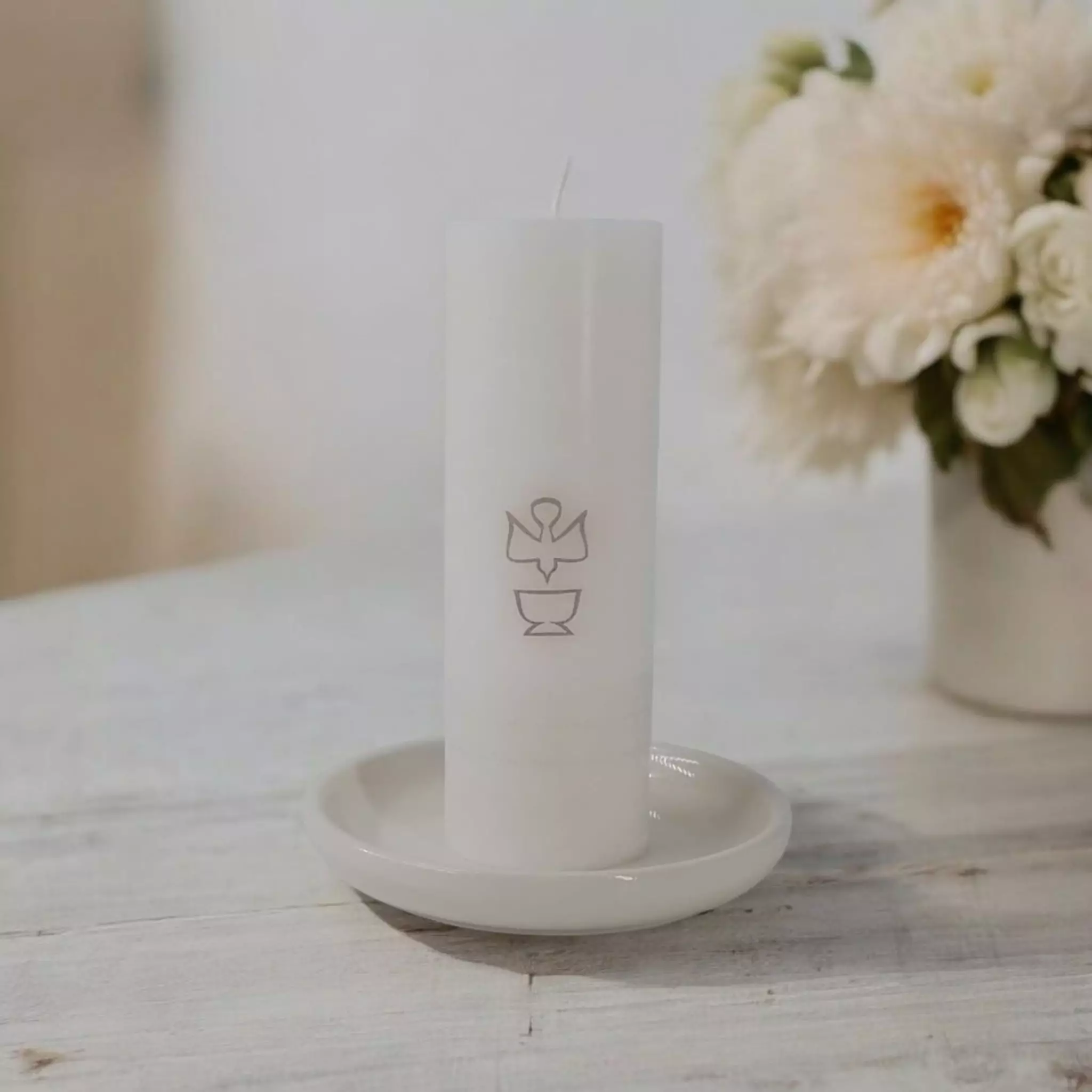 Kynttilässä on kaunis Pyhän hengen kyyhkyn ja kastemaljan kuva sekä tarra, johon voit kirjoittaa lapsen nimen ja kastepäivän. Herkkä kummilahja ja kastepöydän somistus. Settiin kuuluu valkoinen, keraaminen lautanen.
