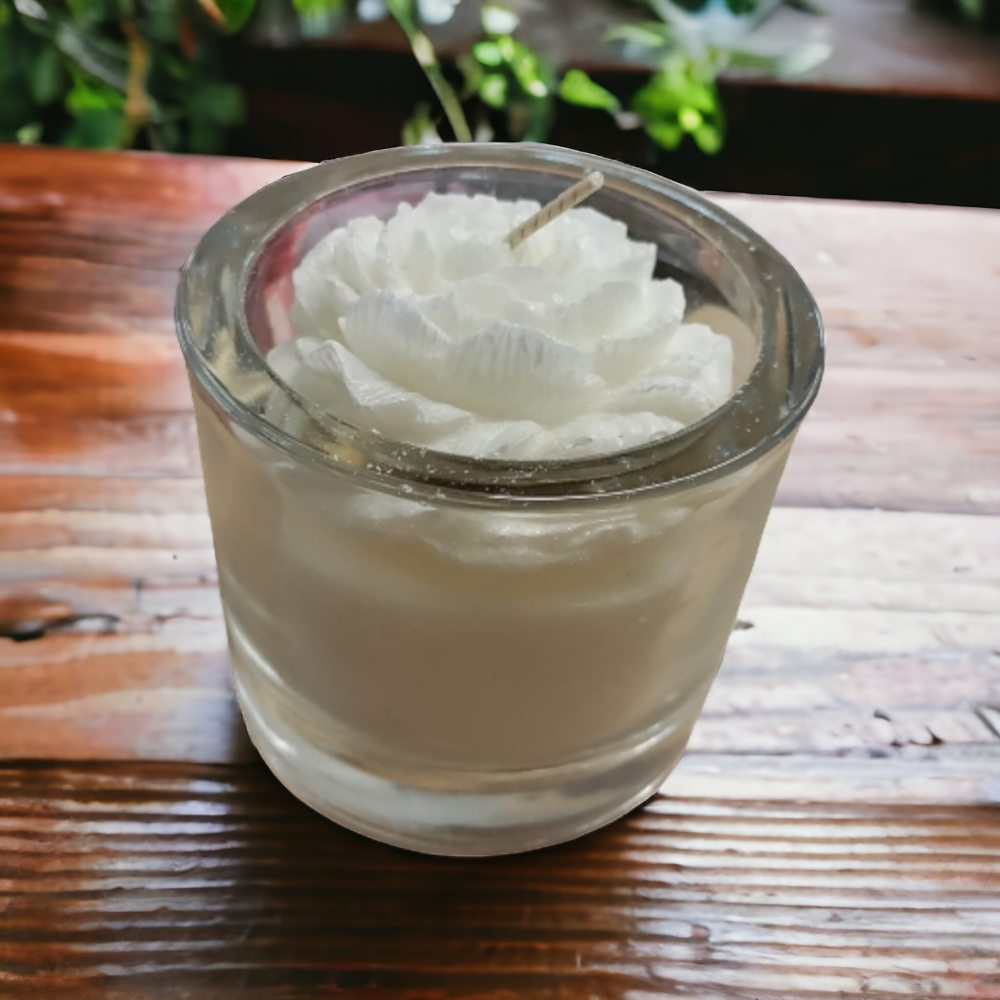 Väri: Kirkas lasipurkki, jossa koristeena pioni