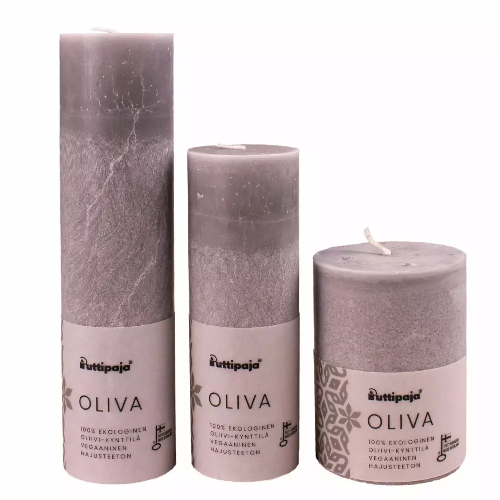 OLIVA-kynttilä on täysin kasvipohjainen ja sen pääraaka-aine on oliivi. Oliivit on kasvatettu Italiassa, jossa ne myös jalostetaan kynttilän raaka-aineeksi. Raaka-aine matkaa meille Vaajakoskelle ja näin ollen OLIVA-kynttilät tuotetaan kokonaan EU:n sisällä.