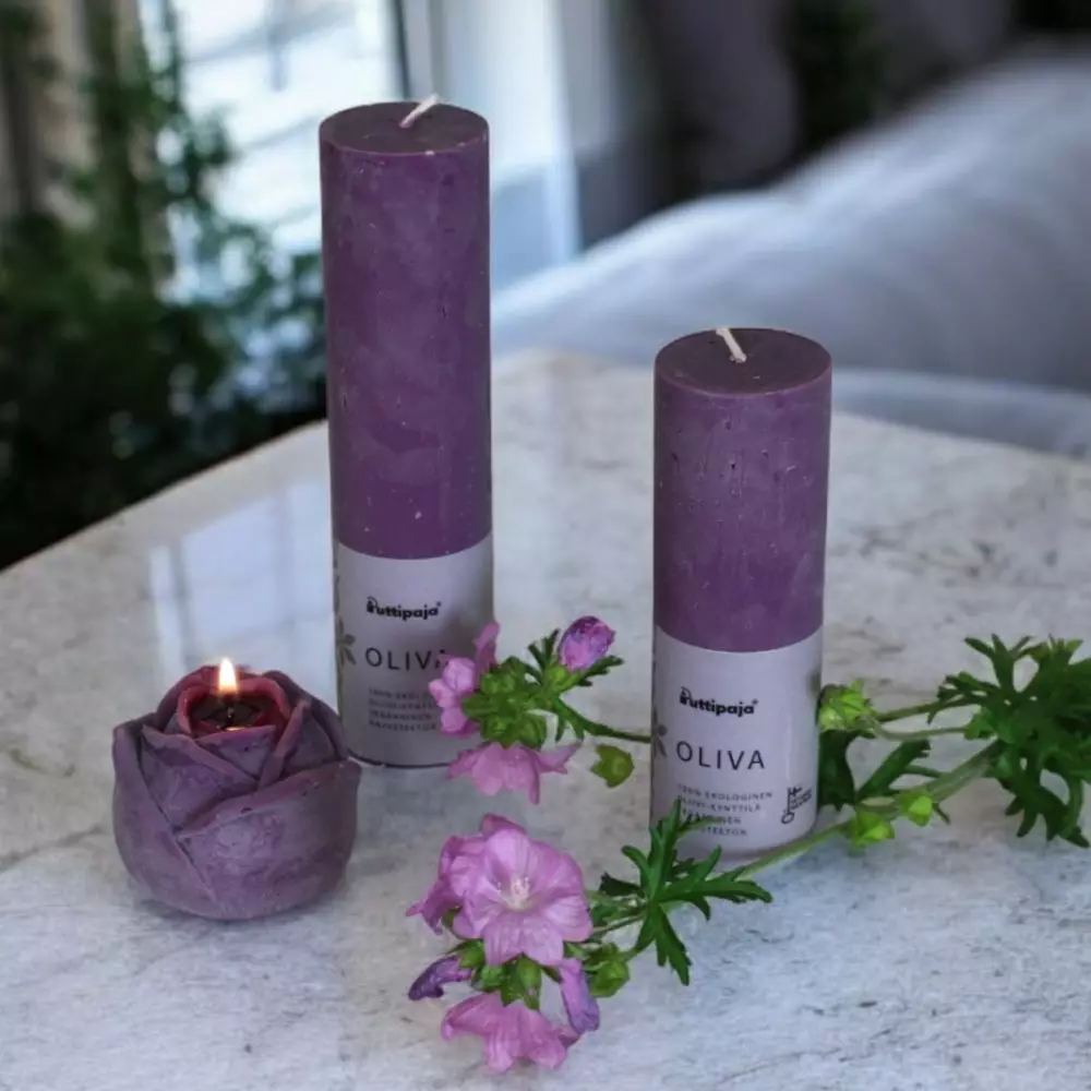 Läpivärjätty oliivi-kynttilä Väri: Luumu Koostumus: 100% oliivivaha Kynttilän paloaika: 5x15 cm ~38 h 5x20 cm ~50 h