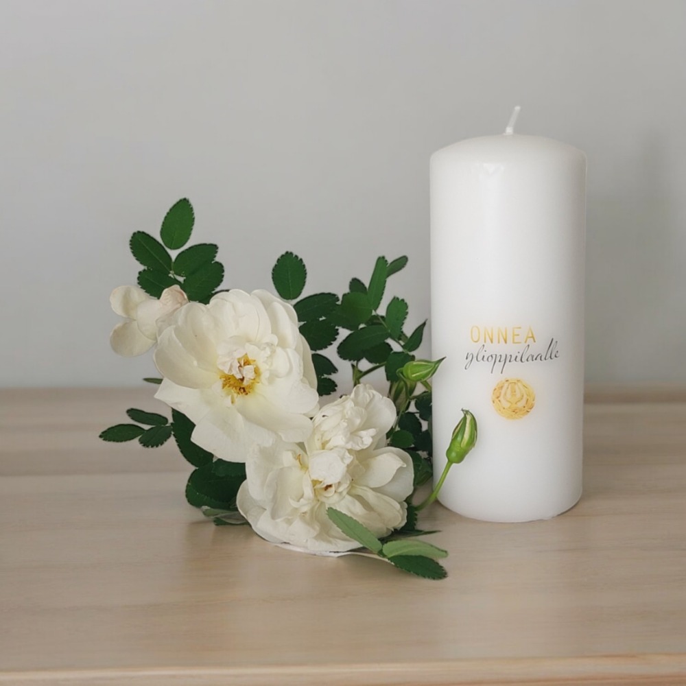 Tyylikäs onnittelukynttilä ylioppilaalle!