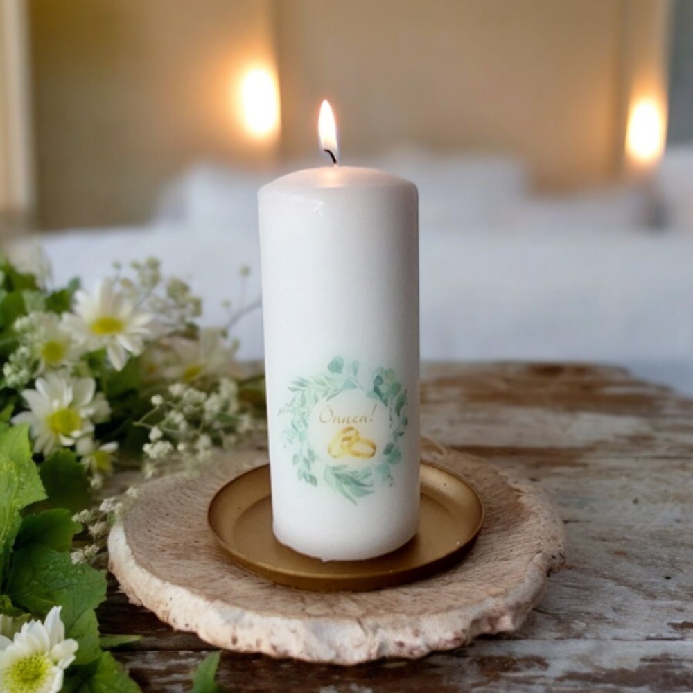 Siirtokuvatekniikalla koristettu kaunis onnittelukynttilä hää- tai kihlaparille. Tämä kynttilä tuo hyvin tunnelmaa myös juhlapöydän somisteena.